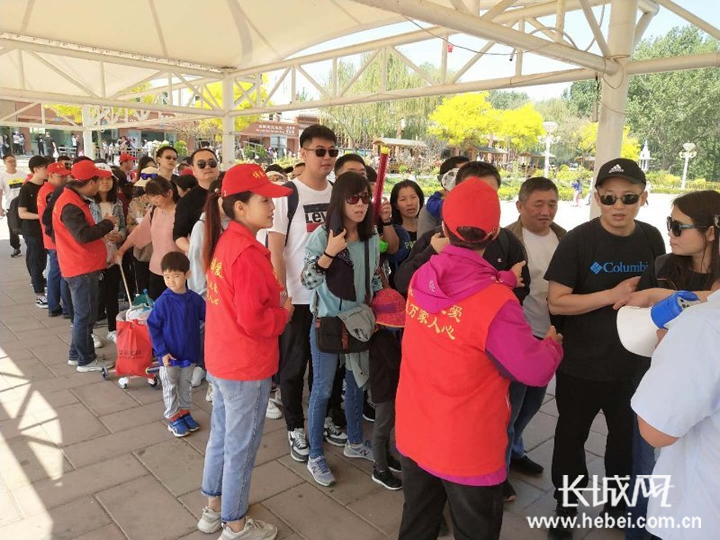 白洋淀景区,游客们在志愿者的帮助下排队购票。王渊 摄