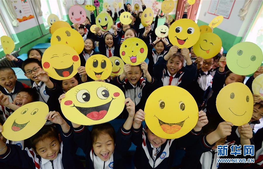 5月7日,河北省邯郸市光明南小学的学生在展示笑脸卡。当日,各地学校举办丰富多彩的“微笑”主题活动,迎接5月8日世界微笑日的到来。新华社发(郝群英 摄)