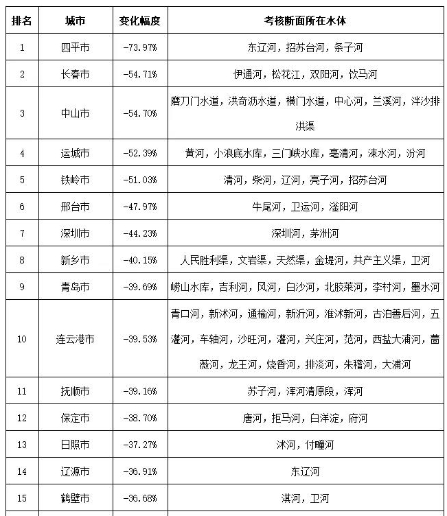 2019年1-3月国家地表水考核断面水质变化情况排名前15位城市及所在水体