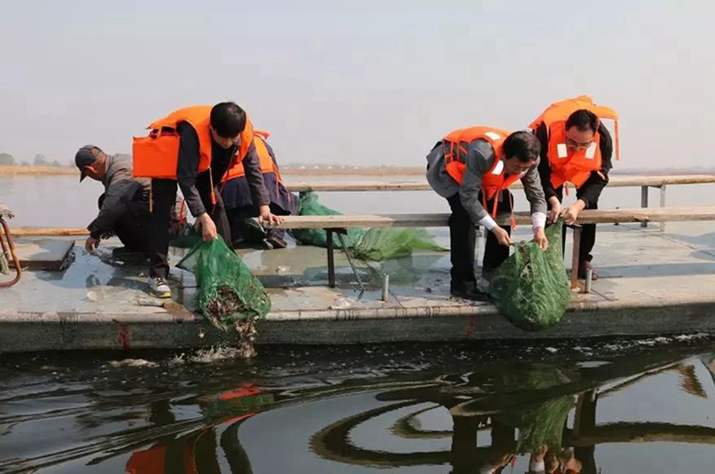 4月3日,安新县农业农村局在白洋淀水域开展中华绒螯蟹人工放流活动。图为活动现场。 赵会英摄