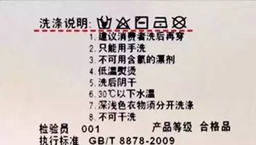 洗涤标识必须按照洗涤、晾晒、熨烫等顺序标注,如果顺序混乱,很可能是厂家不太正规。因此购买时,若吊牌上没有洗涤说明,或者洗涤说明不是按照正确的顺序标明的,建议不要购买。