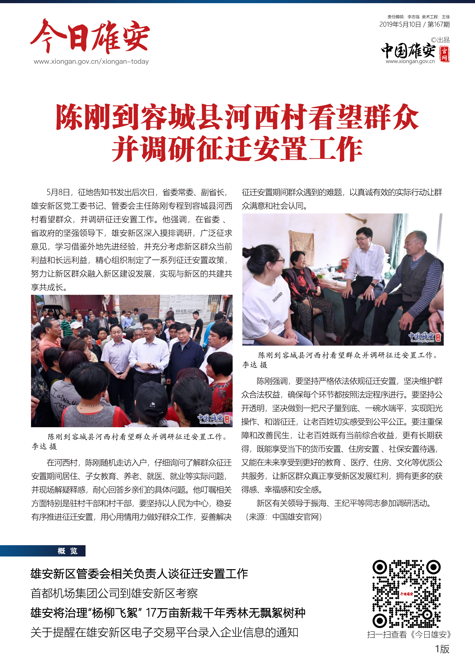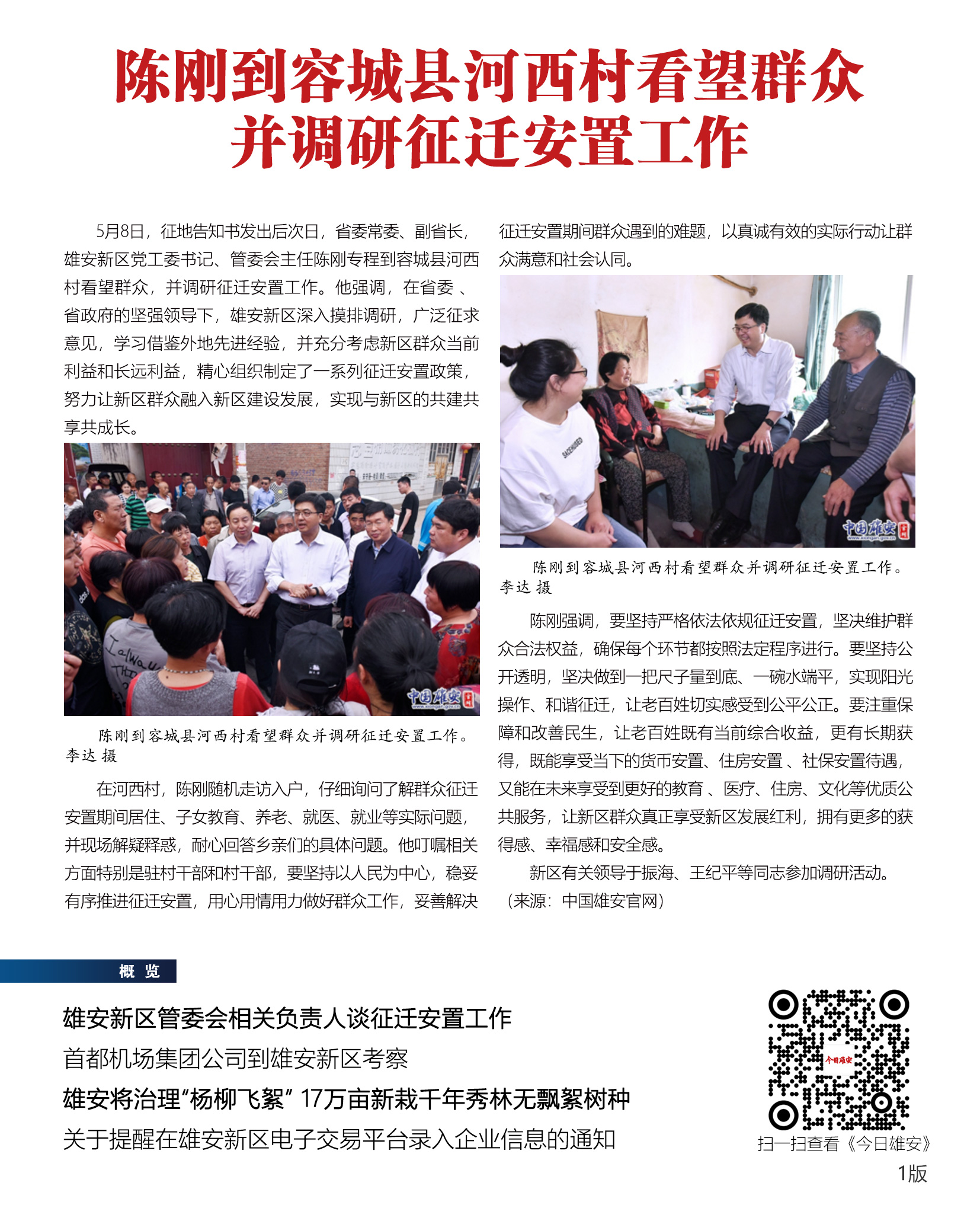 5月8日,河北省委常委、副省长,雄安新区党工委书记、管委会主任陈刚专程到容城县河西村看望群众,并调研征迁安置工作。