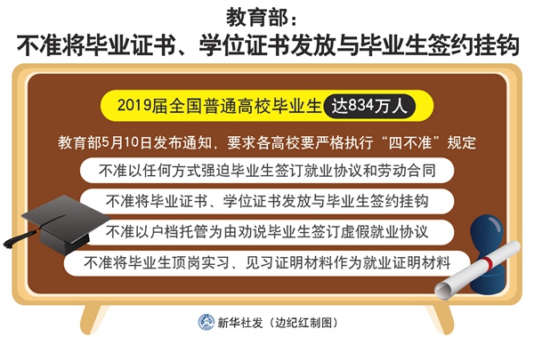 8. 教育部5月10日发布通知,要求各高校要严格执行“四不准”规定,即不准以任何方式强迫毕业生签订就业协议和劳动合同,不准将毕业证书、学位证书发放与毕业生签约挂钩,不准以户档托管为由劝说毕业生签订虚假就业协议,不准将毕业生顶岗实习、见习证明材料作为就业证明材料。
