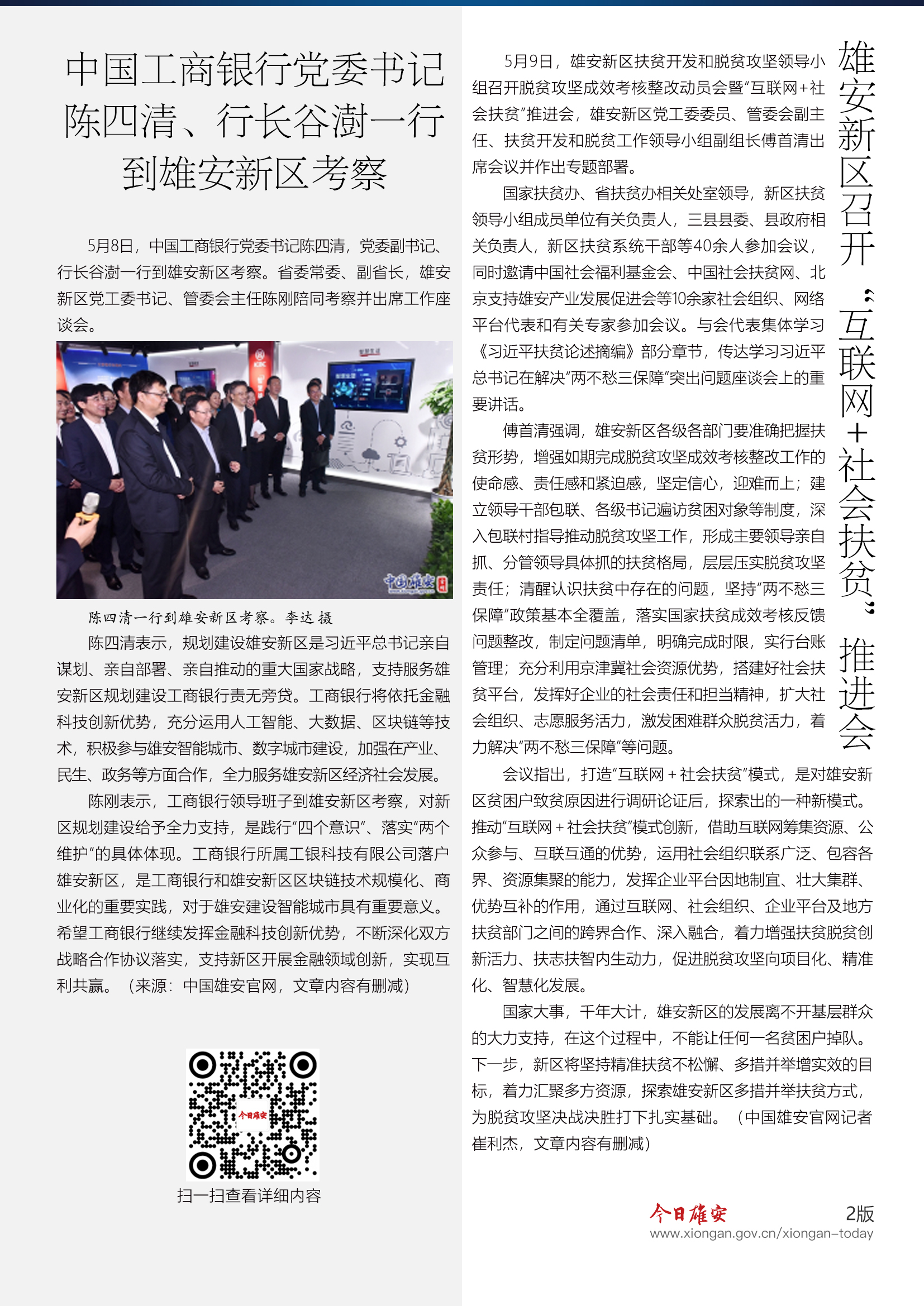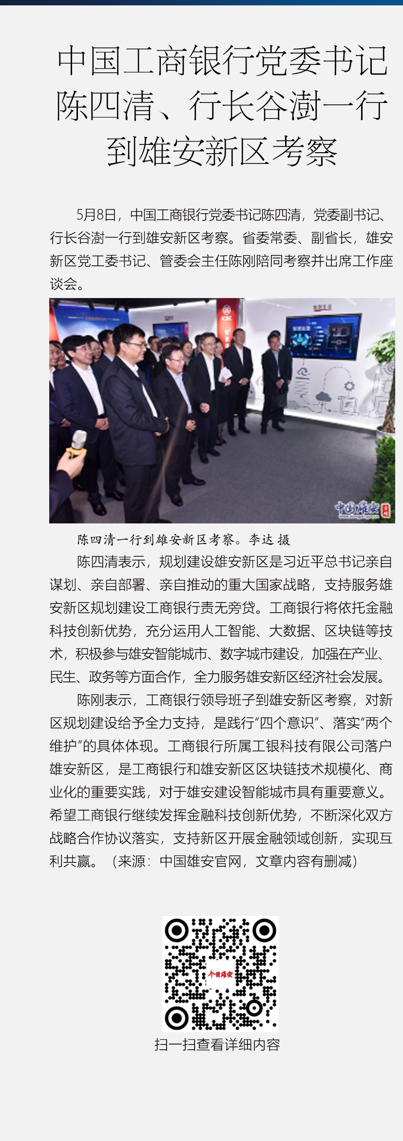 5月8日,中国工商银行党委书记陈四清,党委副书记、行长谷澍一行到雄安新区考察。