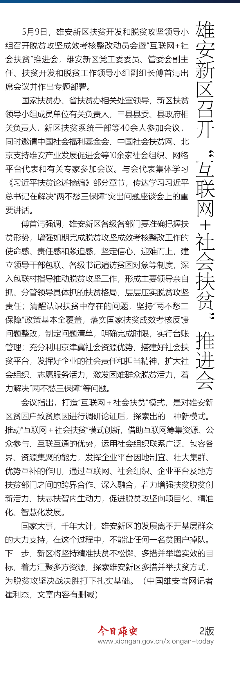 5月9日,雄安新区扶贫开发和脱贫攻坚领导小组召开脱贫攻坚成效考核整改动员会暨“互联网+社会扶贫”推进会。