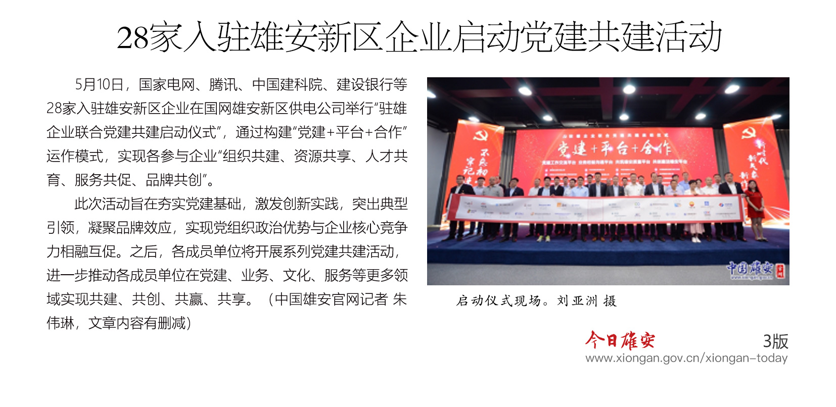 5月10日,国家电网、腾讯、中国建科院、建设银行等28家入驻雄安新区企业在国网雄安新区供电公司举行“驻雄企业联合党建共建启动仪式”。