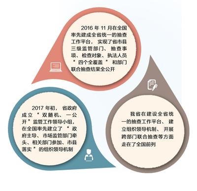 2015年7月,国务院部署开展“双随机、一公开”监管工作以来,我省积极探索推进“双随机、一公开”监管工作。2016年11月在全国率先建成全省统一的抽查工作平台,实现了省市县三级监管部门、抽查事项、检查对象、执法人员“四个全覆盖”和部门联合抽查结果全公开。2017年初,省政府成立“双随机、一公开”监管工作领导小组,在全国率先建立了“政府主导、市场监管部门牵头、相关部门参加、市县落实”的组织领导机制。我省在建设全省统一的抽查工作平台、建立组织领导机制、开展跨部门联合抽查等方面走在了全国前列。