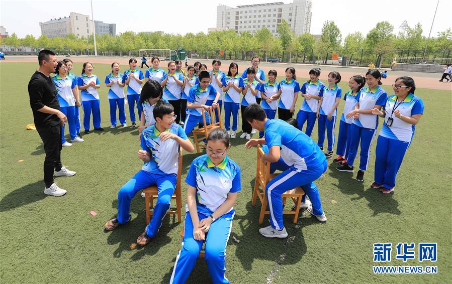5月14日,河北省唐山市海港经济开发区第二中学的高三学生在操场上做趣味游戏。 2019年高考在即,河北省唐山市海港经济开发区第二中学开展多种形式的集体减压活动,帮助学生释放紧张情绪,以平和、乐观的心态迎接高考。新华社发(李磊 摄)