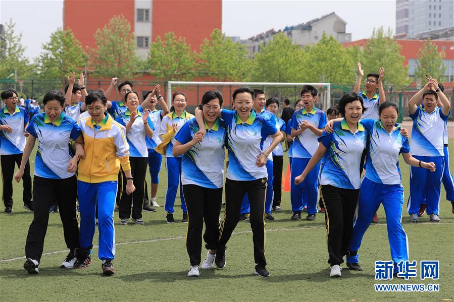 5月14日,河北省唐山市海港经济开发区第二中学的高三学生在操场上做趣味游戏。 2019年高考在即,河北省唐山市海港经济开发区第二中学开展多种形式的集体减压活动,帮助学生释放紧张情绪,以平和、乐观的心态迎接高考。新华社发(李磊 摄)