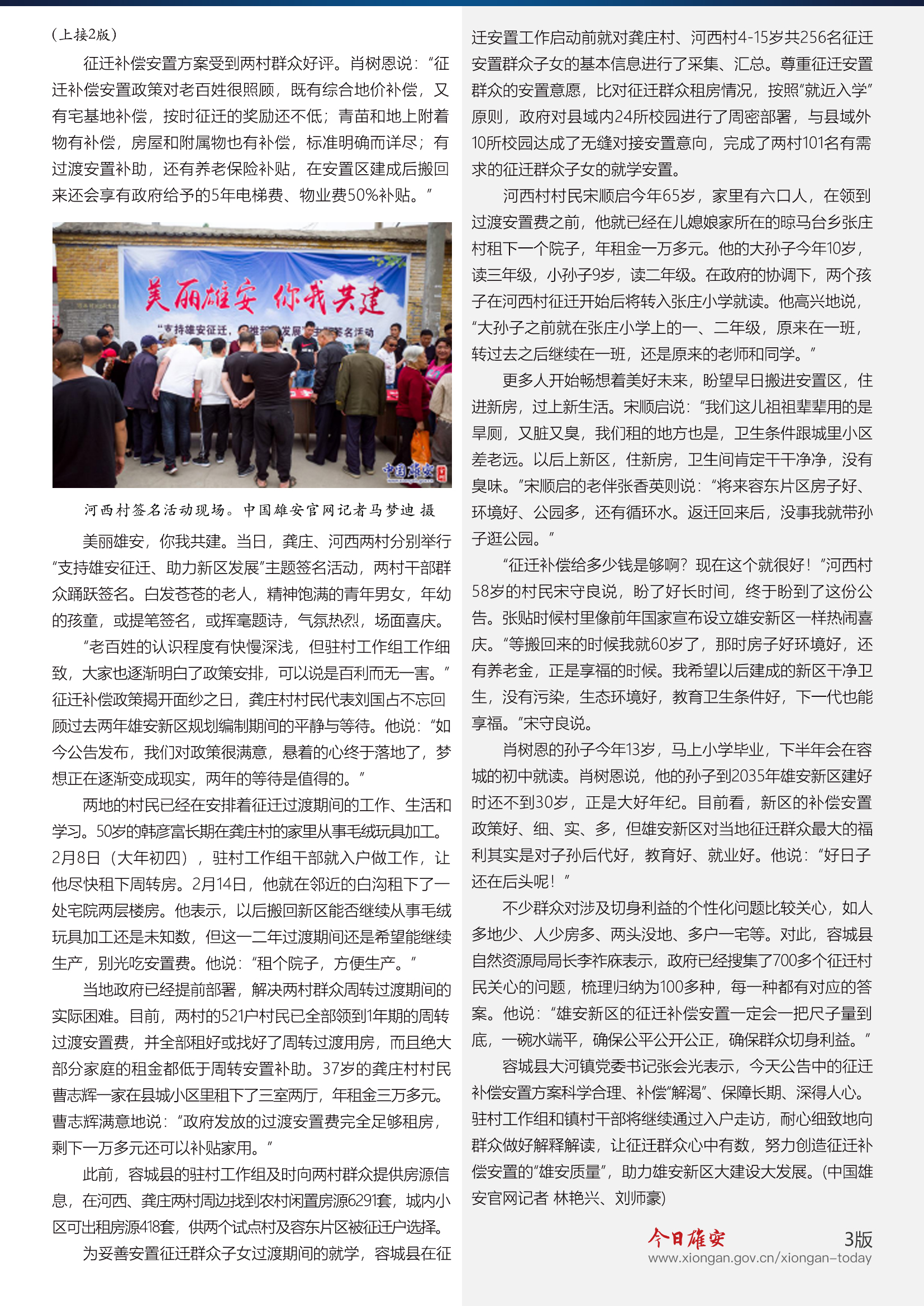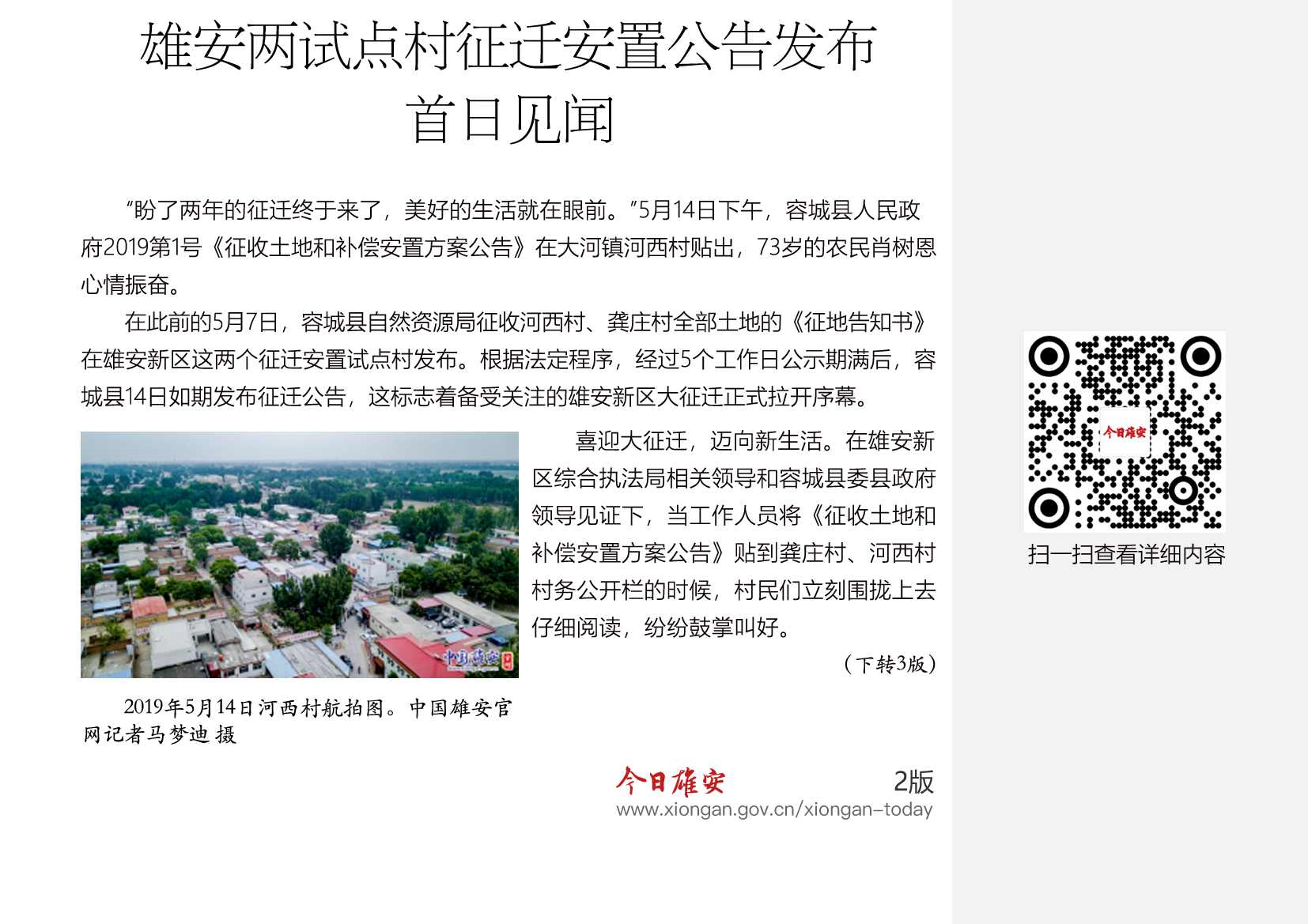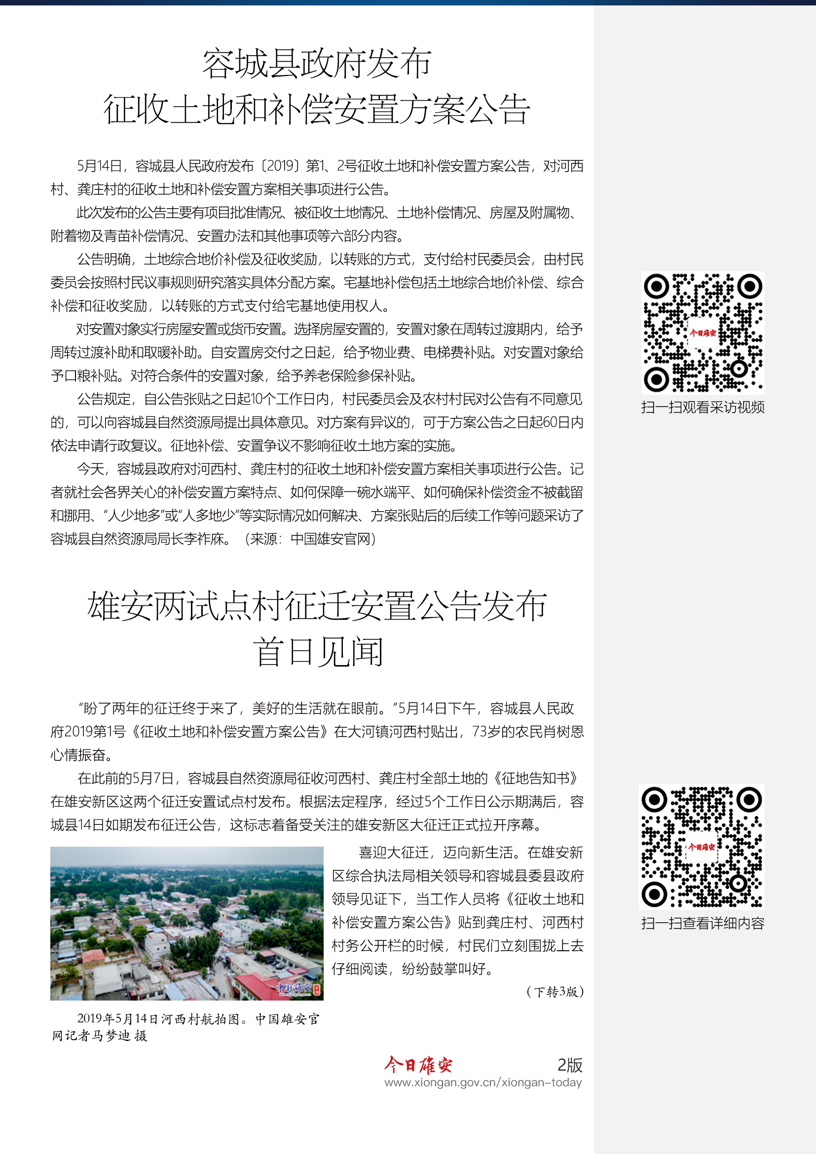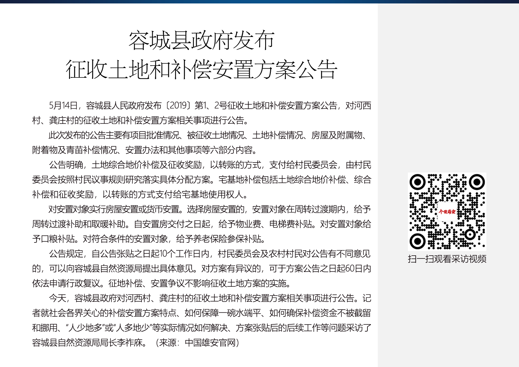5月14日,容城县人民政府发布〔2019〕第1、2号征收土地和补偿安置方案公告,对河西村、龚庄村的征收土地和补偿安置方案相关事项进行公告。