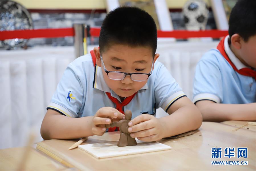 5月17日,在石家庄市桥西区冀台联青年文化创业园,桥西区南马路小学的学生在学习制作泥塑。新华社发(刘沛然 摄)