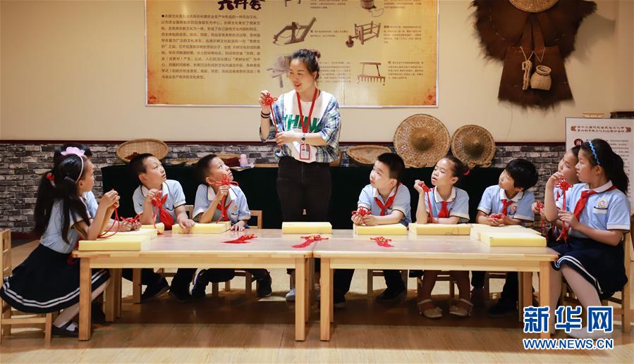 5月17日,在石家庄市桥西区冀台联青年文化创业园,桥西区南马路小学的学生在学习编织技艺。新华社发(刘沛然 摄)