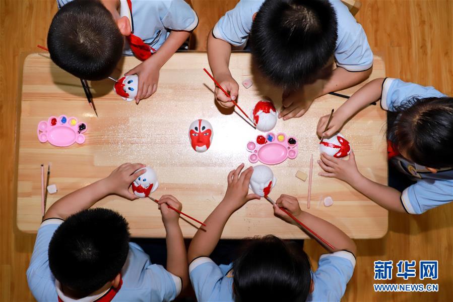 5月17日,在石家庄市桥西区冀台联青年文化创业园,桥西区南马路小学的学生在体验脸谱绘画。新华社发(刘沛然 摄)