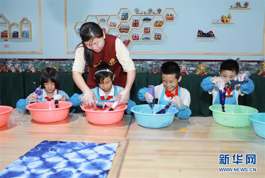 5月17日,在石家庄市桥西区冀台联青年文化创业园,桥西区南马路小学的学生在体验扎染技艺。新华社发(刘沛然 摄)