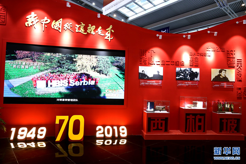 进入展区“前厅”,以中国红为主色调、象征“高举旗帜”的红旗造型墙引人注目。据展区负责人介绍,该板块展览内容包括西柏坡历史、雄安新区两周年建设成就以及“学习强国”河北学习平台教育体验中心项目。
