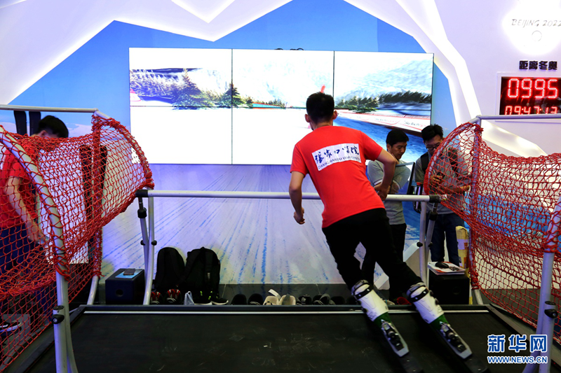 运动员正在体验模拟互动滑雪仪。新华网 张鹏摄