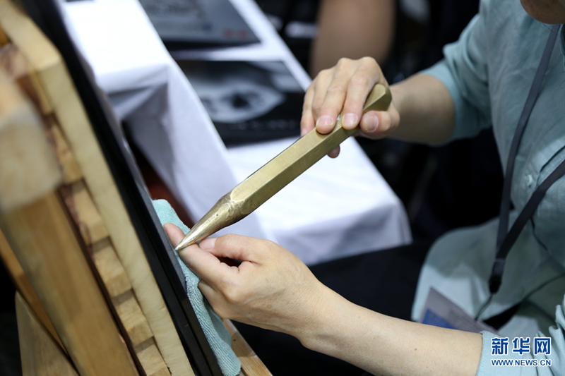 在“匠心传承”板块,河北省石影雕技艺传承人方士英现场为观众制作石影雕,随着手腕力度的变化,錾子在黑色的石板上留下或白或灰、深浅不一的小圆点。新华网 张鹏摄