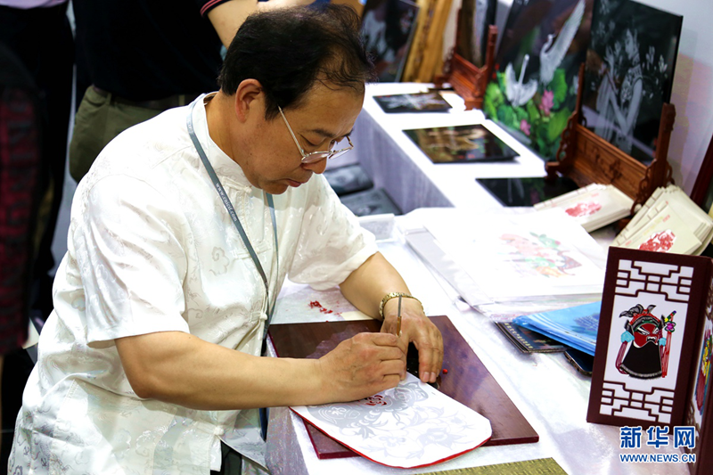 图为中国民间文艺家协会会员焦新德现场制作蔚县剪纸。新华网 张鹏摄
