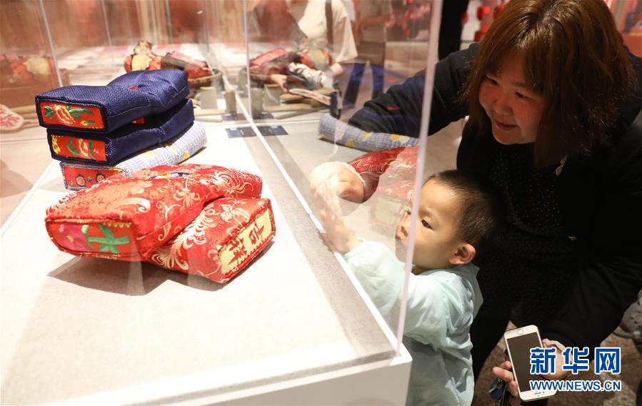 5月18日,在河北博物院内,一名小朋友在家人的陪伴下观赏刺绣枕头。 当日,第十二届河北省民俗文化节在河北博物院举行。本届民俗文化节以“非遗保护,河北实践”为主题,由“传承德泽 丰芜康宁”“匠心襄扶”“艺曲同辉”“匠艺传续”“霓裳新韵”等板块组成。新华社发(梁子栋 摄)