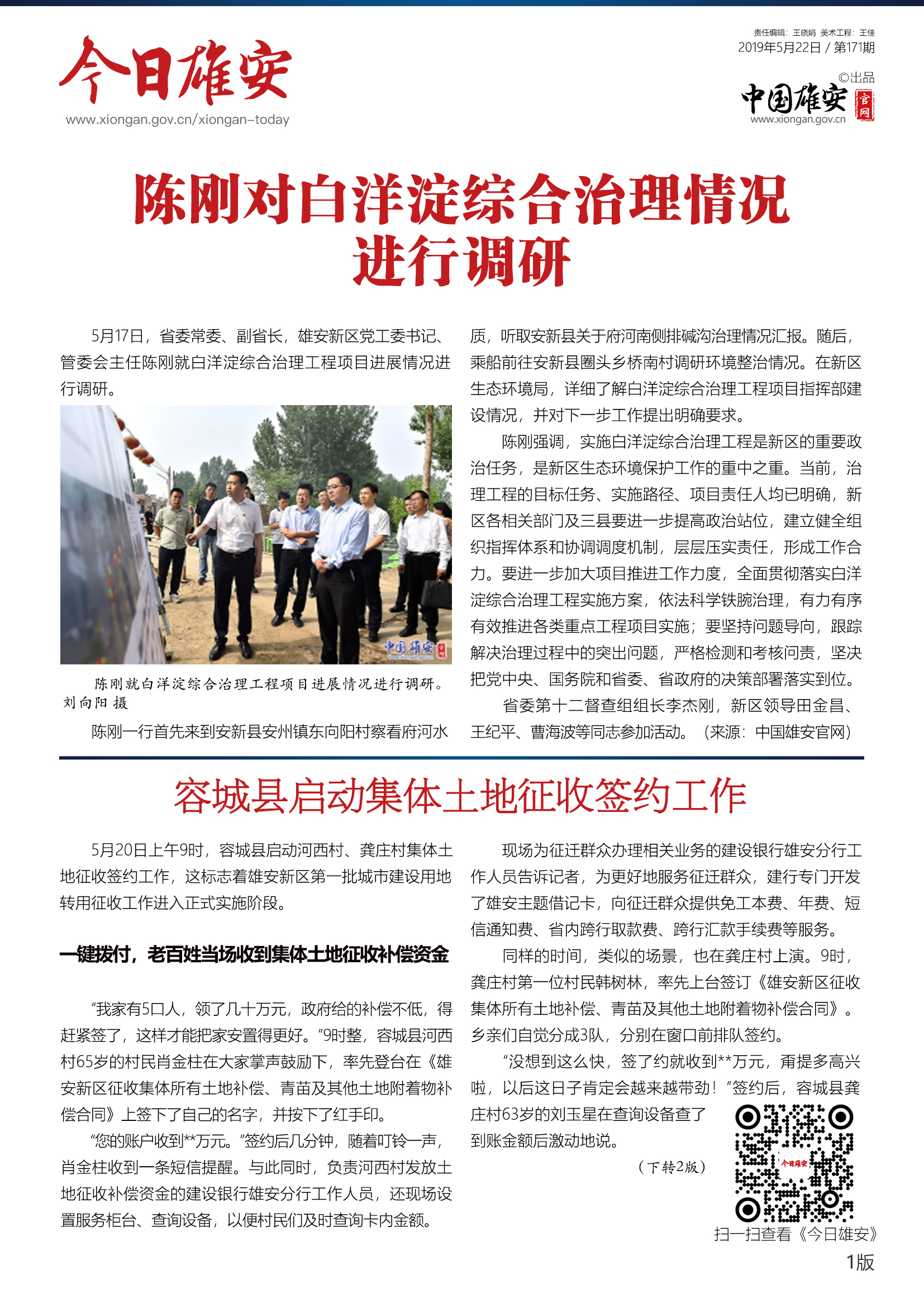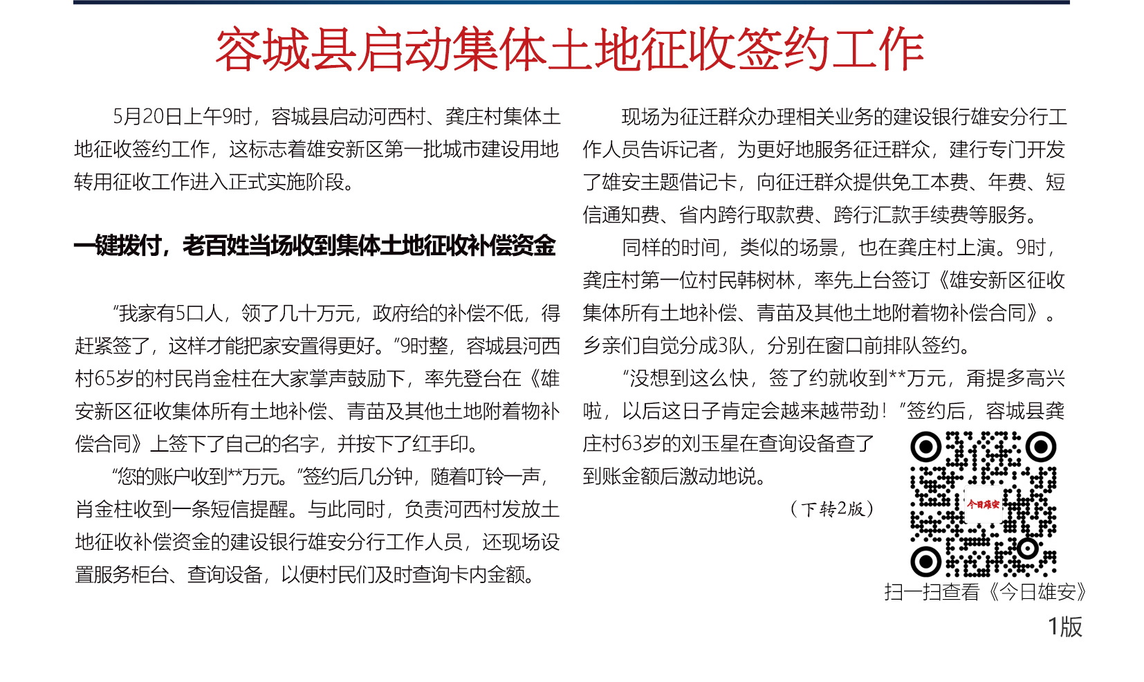 5月20日上午9时,容城县启动河西村、龚庄村集体土地征收签约工作,这标志着雄安新区第一批城市建设用地转用征收工作进入正式实施阶段。