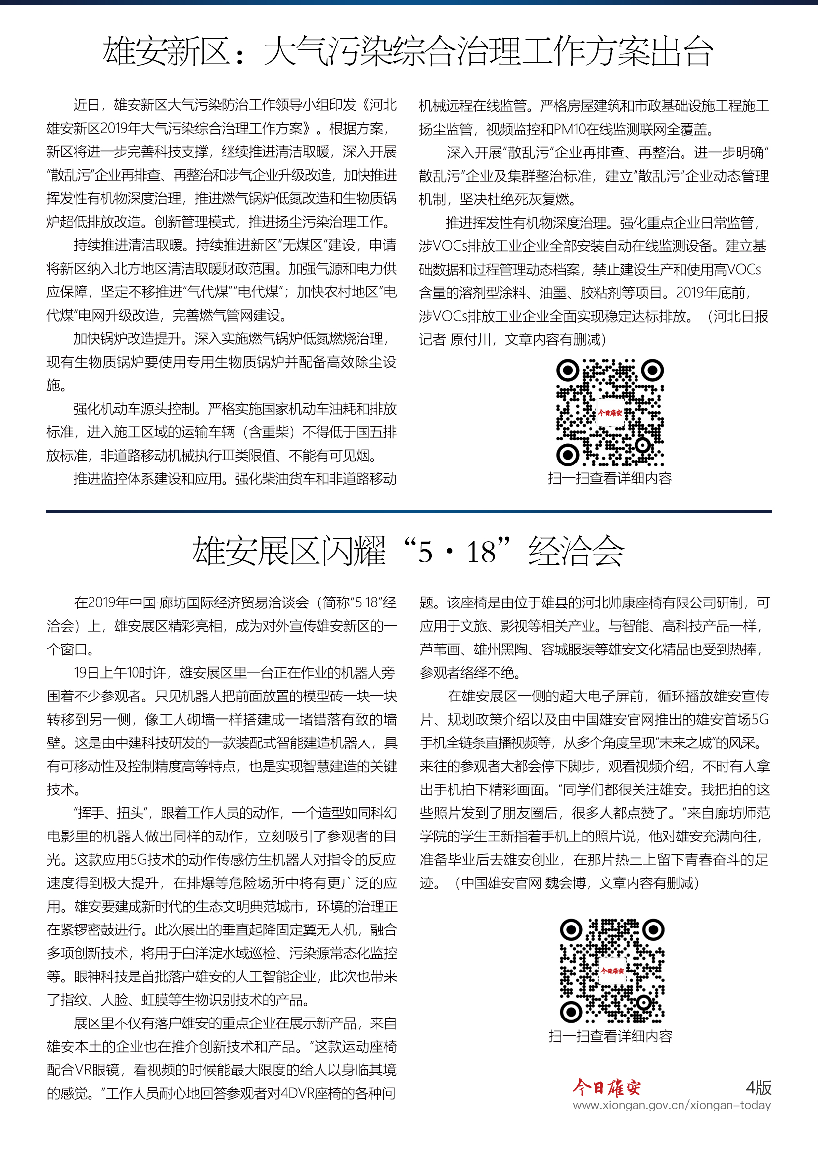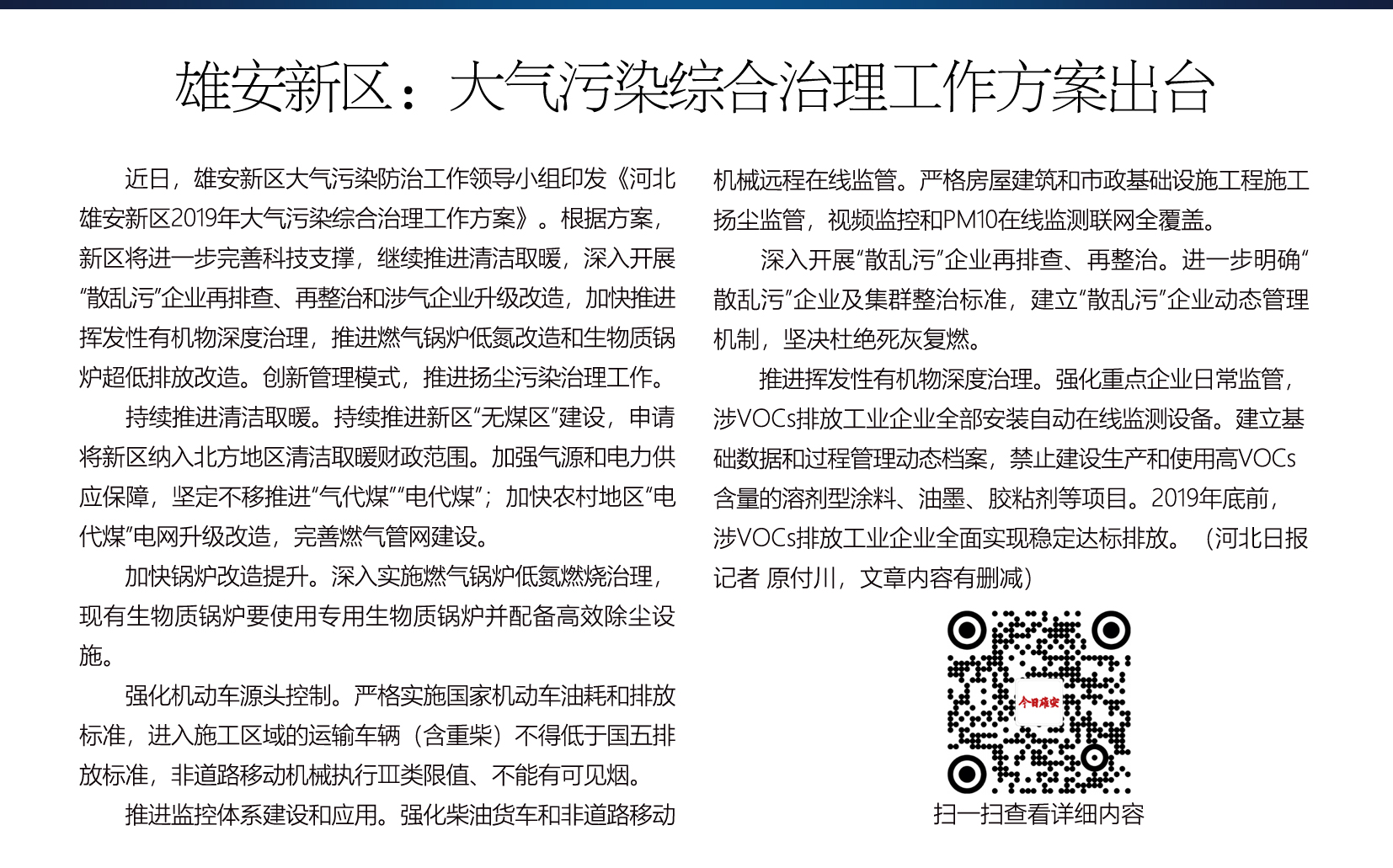 2019年雄安新区细颗粒物(PM2.5)平均浓度比2018年下降6%以上,优良天数比例达到60%以上。