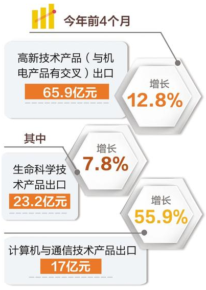高附加值商品出口持续增加。前4个月,我省主要出口商品中,除劳动密集型产品外基本保持增长。机电产品出口255.1亿元,增长14.2%。高新技术产品(与机电产品有交叉)出口65.9亿元,增长12.8%。其中,生命科学技术产品出口23.2亿元,增长7.8%;计算机与通信技术产品出口17亿元,增长55.9%。