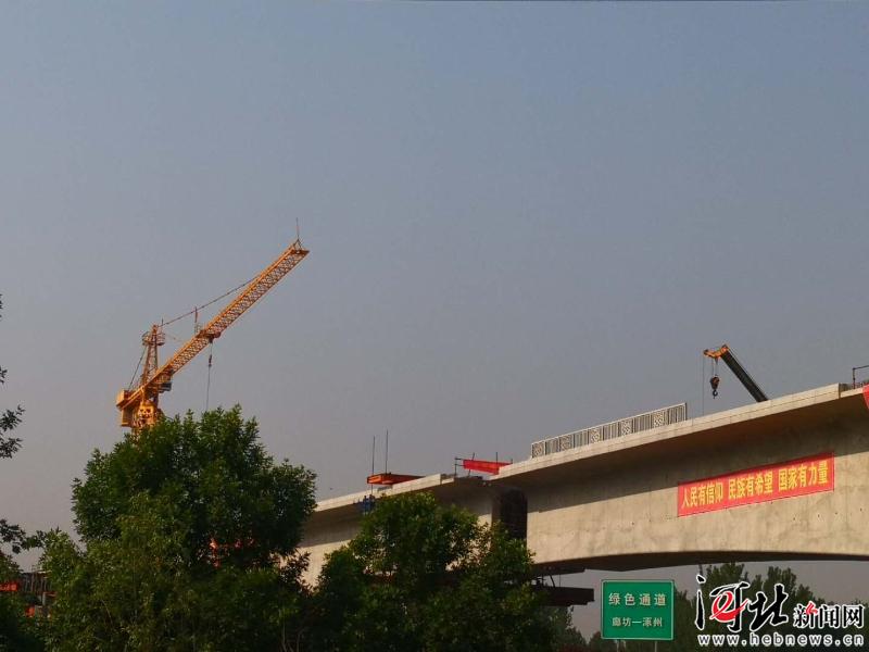 3. 5月25日,京雄城际铁路廊坊段第一转——跨廊涿高速连续梁成功转体,这是高速铁路最大跨度墩顶转体连续梁,也是全铁路建设系统首例不平衡转体连续梁,创新采用了“不平衡长悬臂下滑道墩顶转体”技术,具有安全风险低、转体精度高、交叉干扰少、牵引控制易、施工成本低等优点。