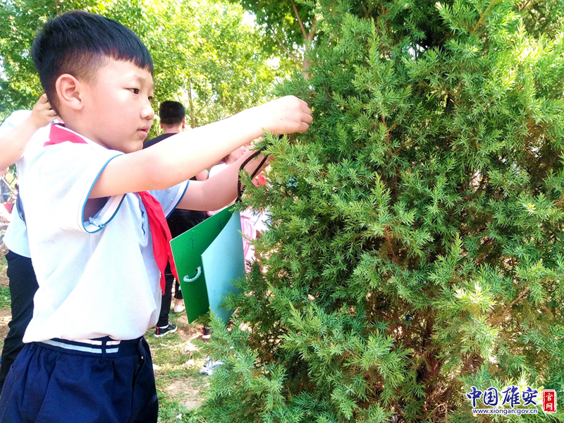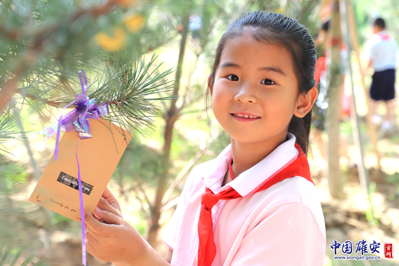 庆祝“六一”,学生在“千年秀林”的树苗上系许愿卡。中关村第三小学雄安校区供图