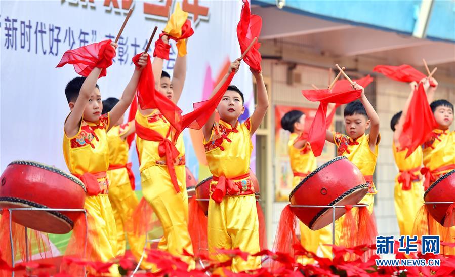 5月30日,河北石家庄市机场路小学的学生在“‘六一’文艺汇演暨新时代好少年表彰大会”上表演节目。新华社发(张晓峰 摄)