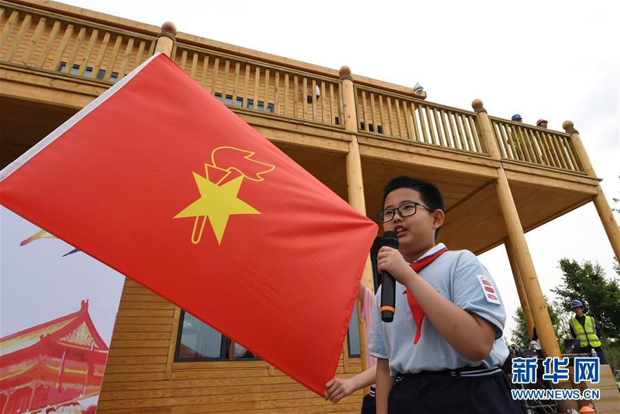 5月30日,中关村第三小学雄安校区少先队队员在活动上为新队员介绍少先队队旗。当日,北京市中关村第三小学雄安校区在雄安新区千年秀林驿站举办“我与雄安共成长”主题少先队新队员入队仪式。新华社记者 朱旭东 摄