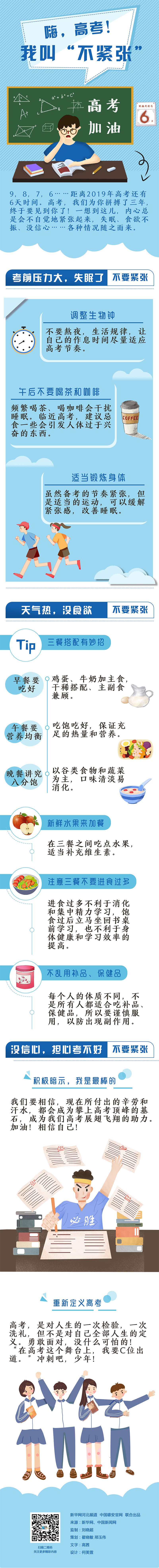 9,8,7,6……距离2019年高考还有6天时间。高考,我们为你拼搏了三年,终于要见到你了!一想到这儿,内心总是会不自觉地紧张起来,失眠、食欲不振、没信心……各种情况随之而来。