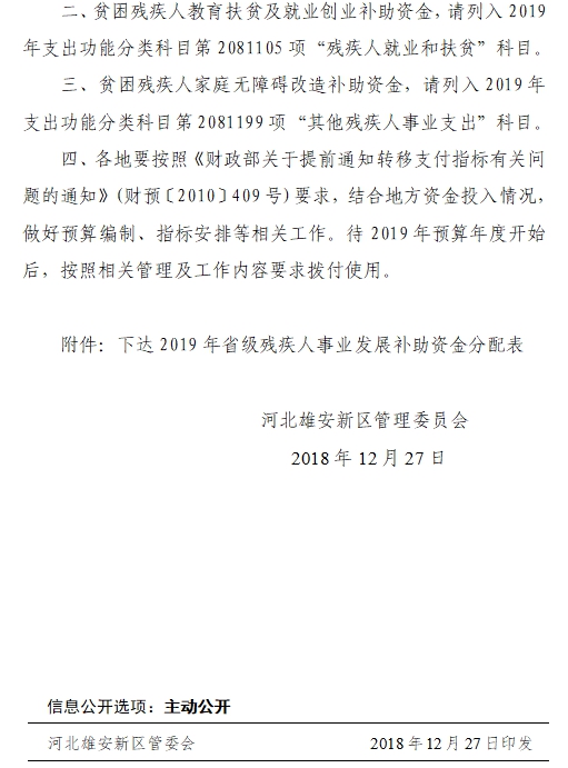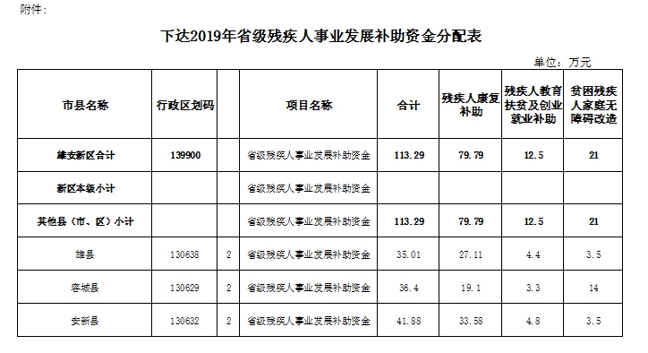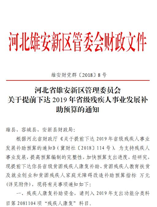 现将雄安新区提前下达2019年省级残疾人事业发展补助预算资金分配结果予以公告,如有异议,请向以下部门提出意见。