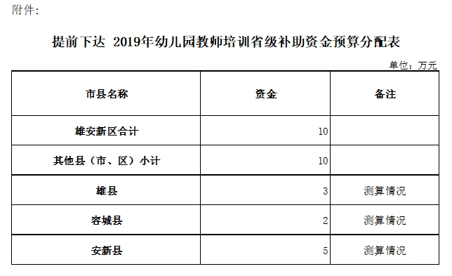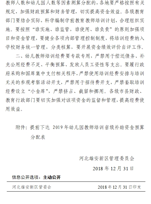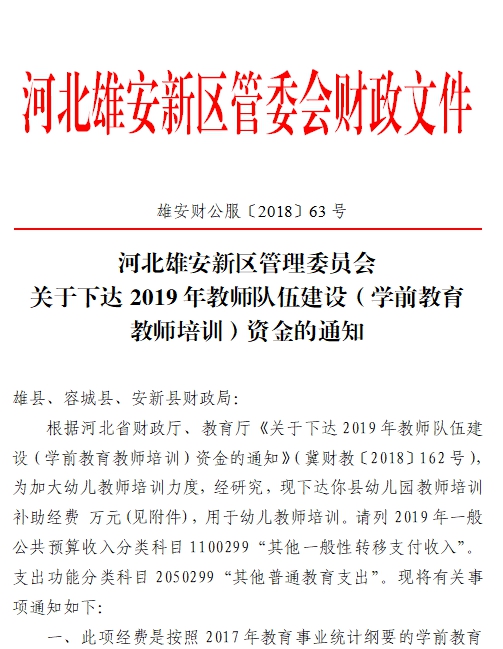 现将雄安新区下达2019年教师队伍建设(学前教育教师培训)资金资金分配结果予以公告,如有异议,请向以下部门提出意见。