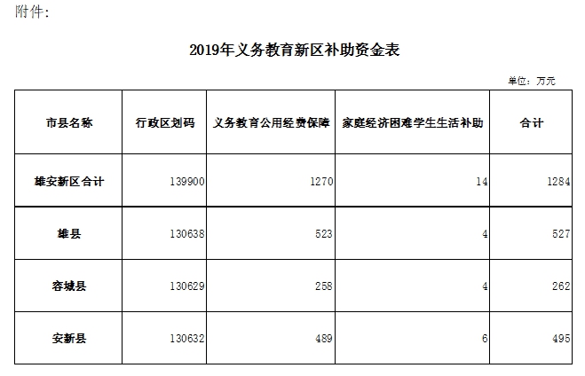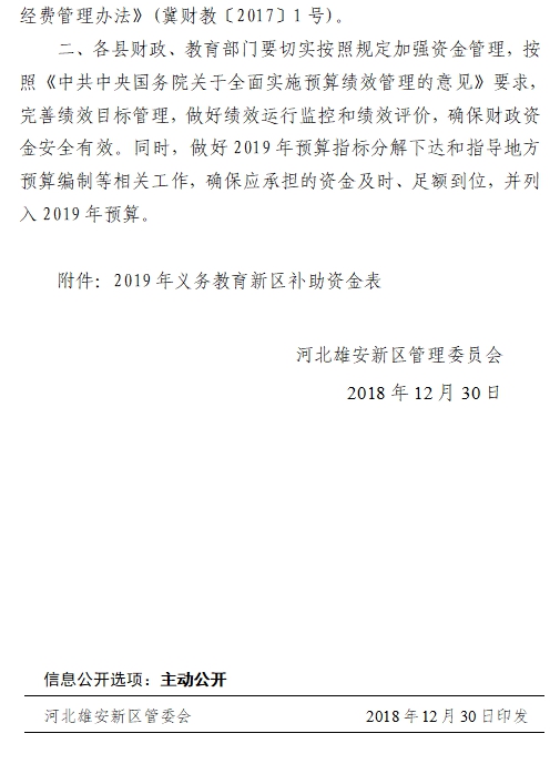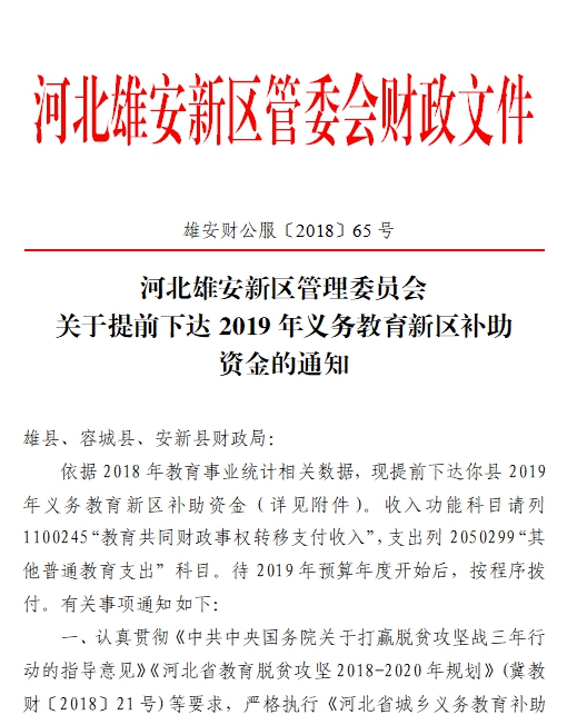 现将雄安新区提前下达2019年义务教育新区补助资金资金分配结果予以公告,如有异议,请向以下部门提出意见。