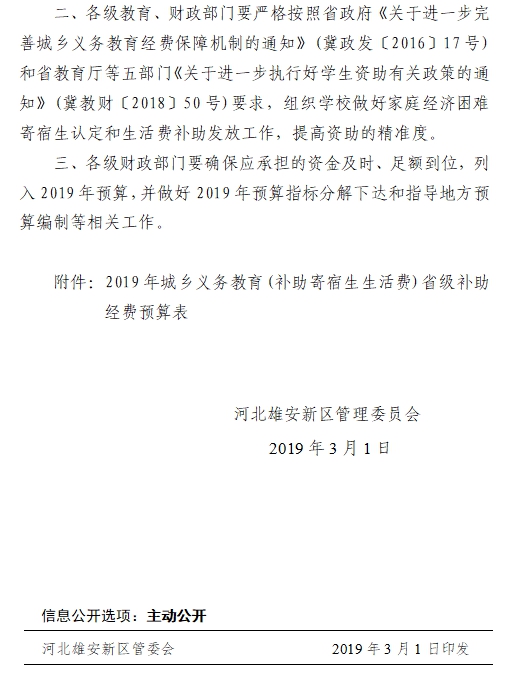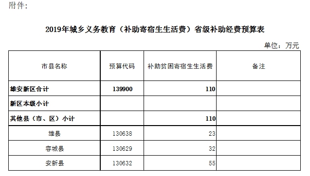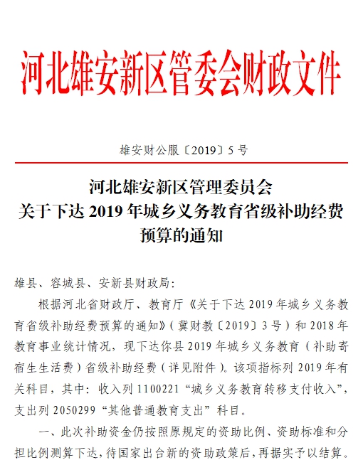 现将雄安新区下达2019年城乡义务教育省级补助经费预算资金分配结果予以公告,如有异议,请向以下部门提出意见。