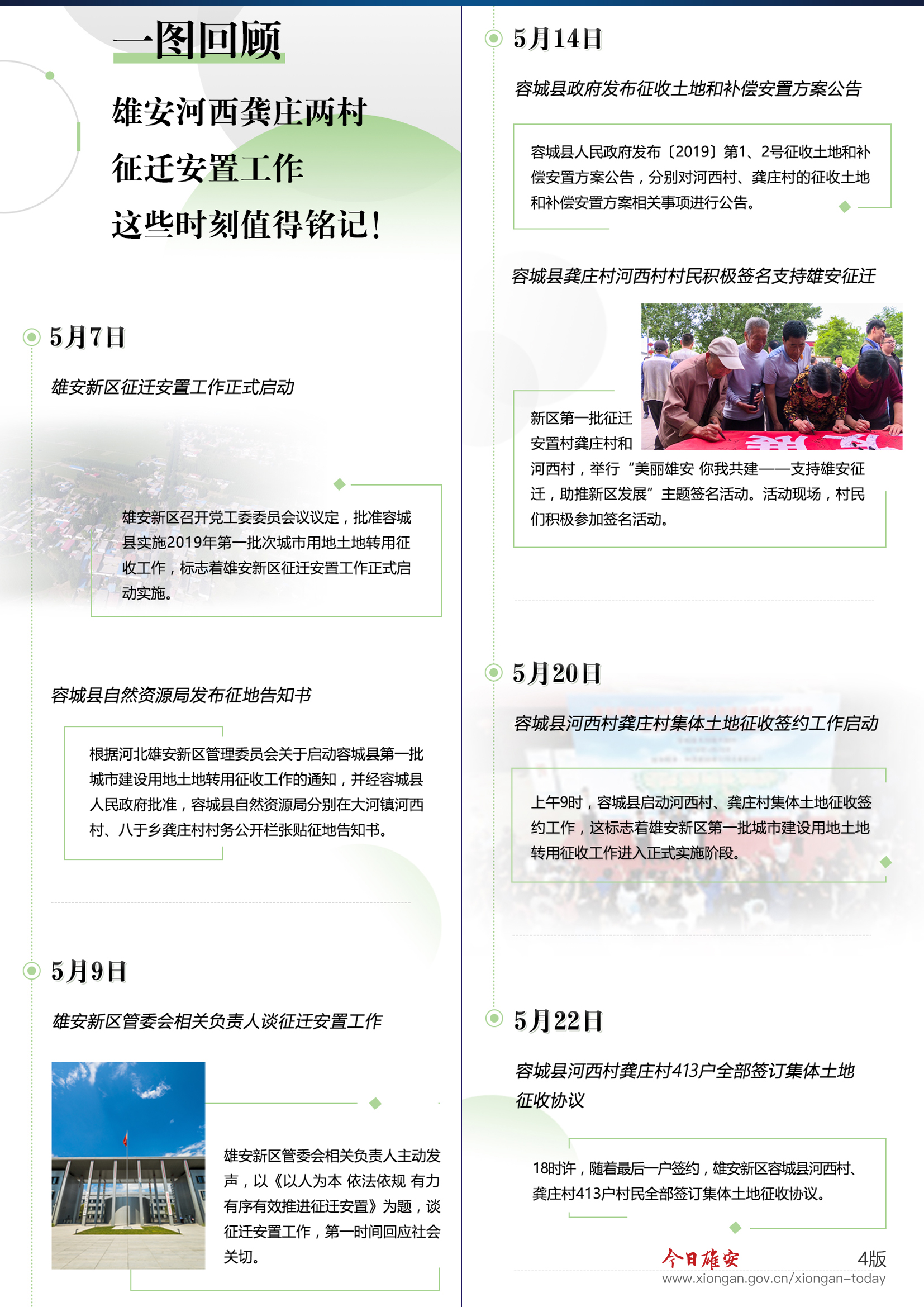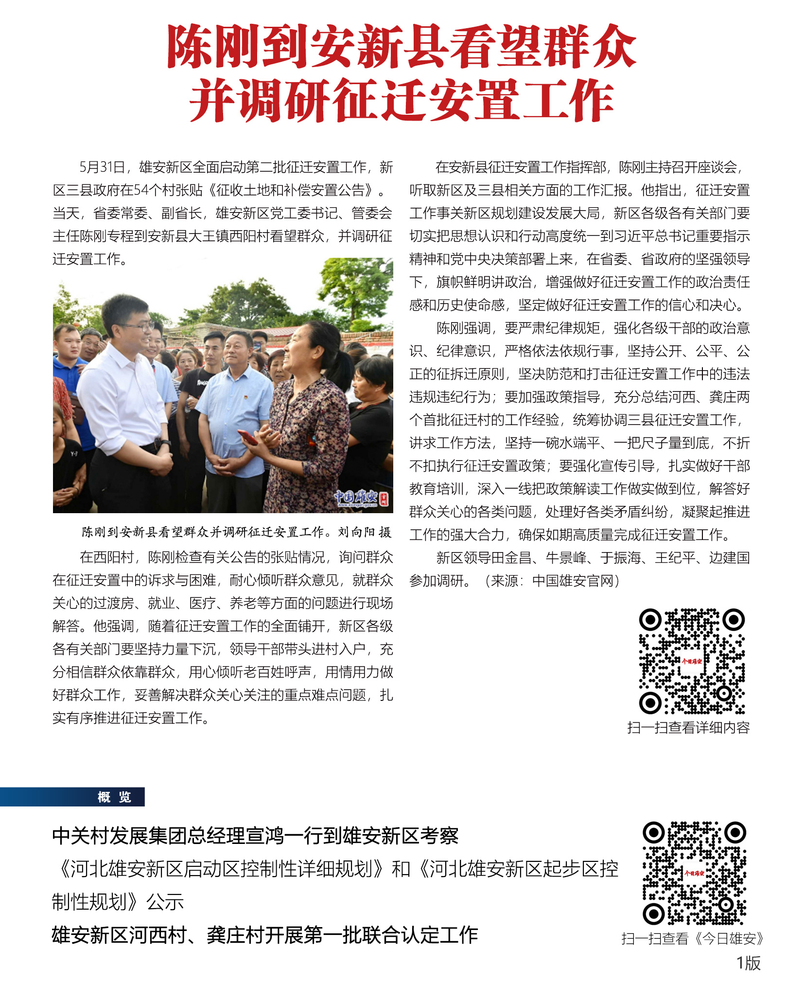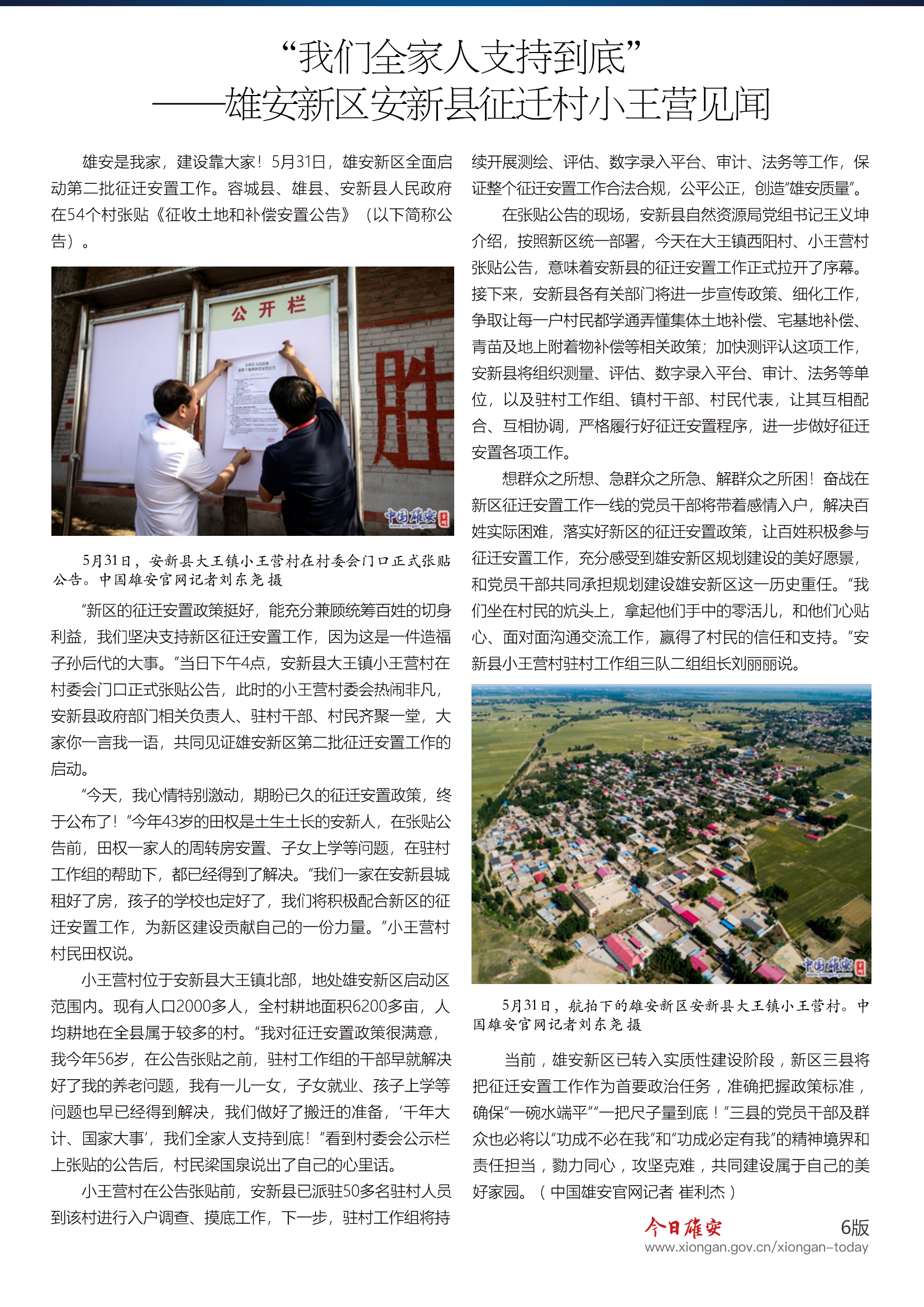 5月31日,雄安新区全面启动第二批征迁安置工作。容城县、雄县、安新县人民政府在54个村张贴《征收土地和补偿安置公告》。