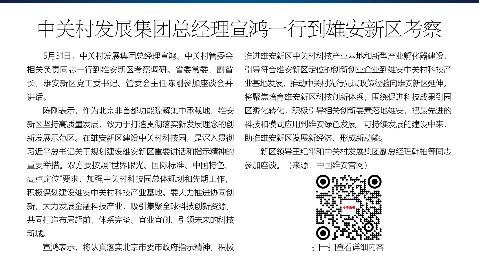 5月31日,中关村发展集团总经理宣鸿、中关村管委会相关负责同志一行到雄安新区考察调研。