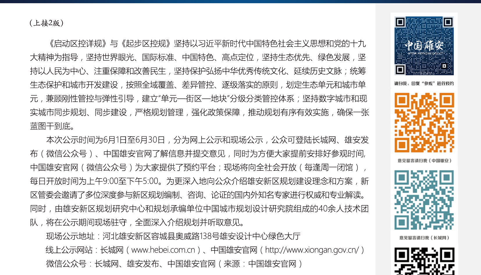 为广泛征求、充分听取社会公众意见和建议,雄安新区党工委、管委会组织《河北雄安新区启动区控制性详细规划》向社会公示。
