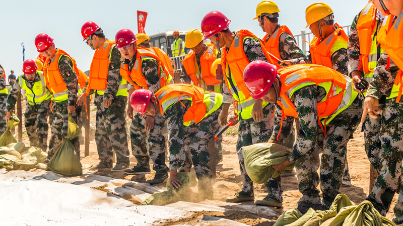 随着警报拉响,演练活动正式开始。100名防汛队员分成5个小组开展应急抢险、人员救治、疏导撤离等演练项目,各小组密切配合,按照既定路线将受灾村民有条不紊地转移到安全地带。演练还特别设定了大堤漫堤场景,现场紧急调度抢险人员携带防汛器材和物资,进行沙袋填装、加固防护,历时半个小时,演练项目全部按计划完成,达到预期效果。
