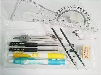 还有2B铅笔、0.5毫米黑色签字笔、直尺、圆规、三角板、无封套橡皮、小刀、空白垫纸板、透明文具袋。