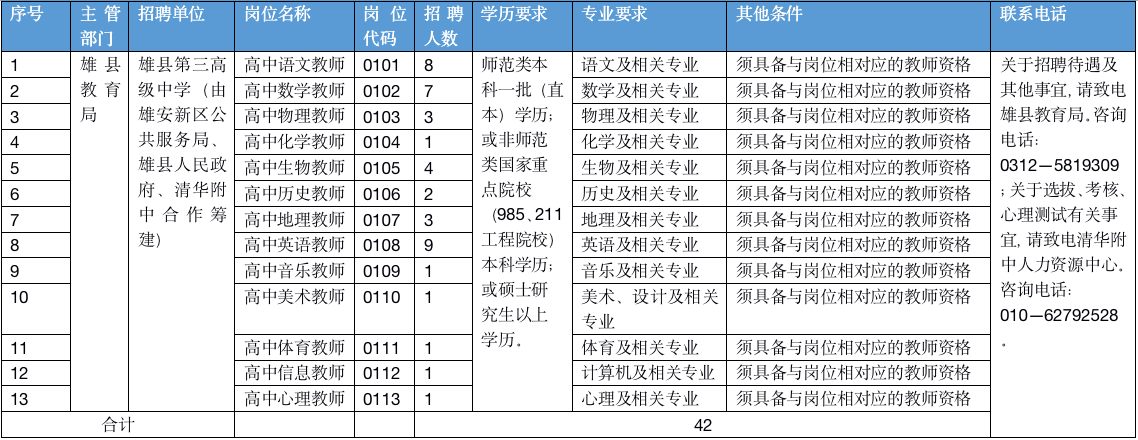 为深入贯彻落实《河北雄安新区规划纲要》“优先发展现代化教育”要求,推动京津冀协同发展,提升雄安新区基础教育水平,由雄安新区公共服务局、雄县人民政府、清华附中合作筹建雄安新区雄县第三高级中学(暂定名,下同)。为进一步发挥北京教育资源优势,促进我县高中教育发展,委托清华附中组织实施新建雄县第三高级中学2019年教师招聘工作。有关事宜如下: