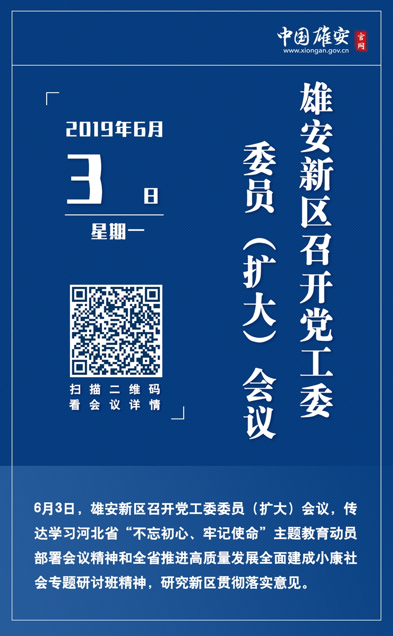 6月3日,雄安新区召开党工委委员(扩大)会议,传达学习河北省“不忘初心、牢记使命”主题教育动员部署会议精神和全省推进高质量发展全面建成小康社会专题研讨班精神,研究新区贯彻落实意见。