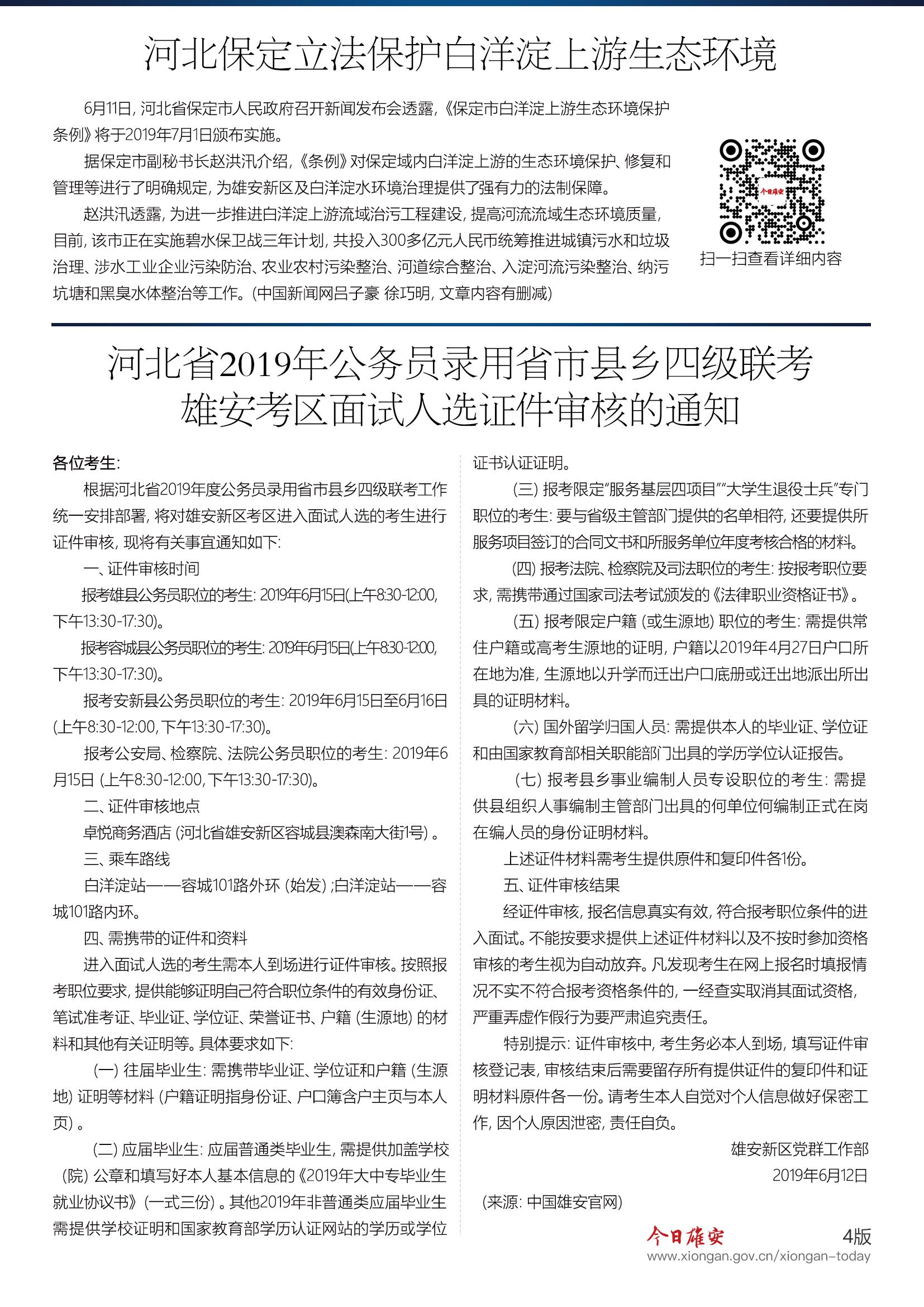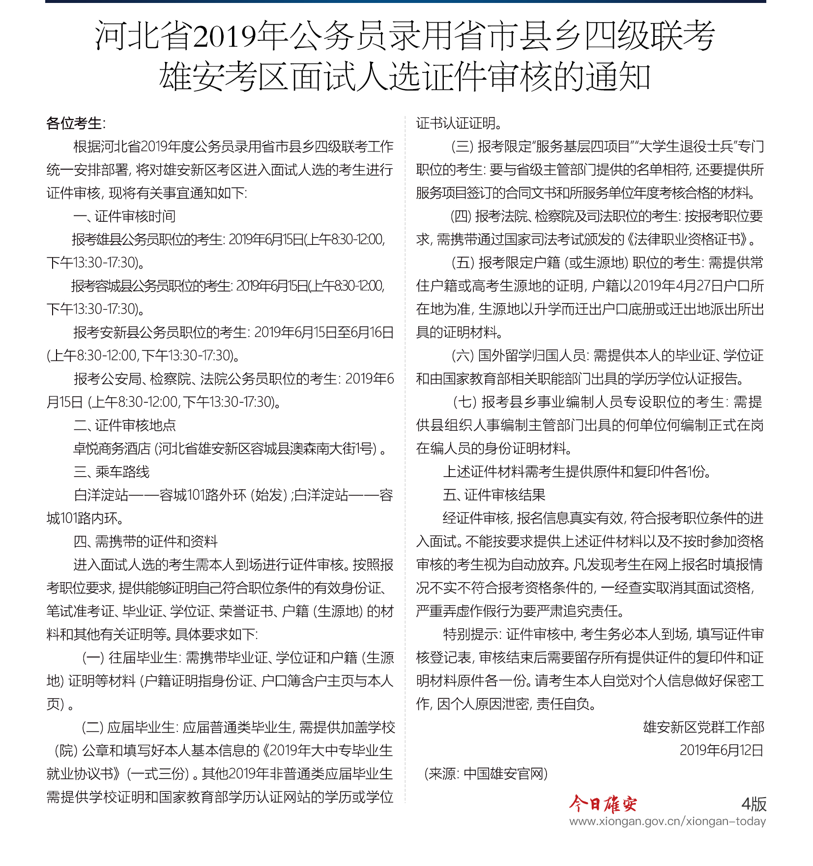河北省2019年公务员录用省市县乡四级联考雄安考区面试人选证件审核的通知
