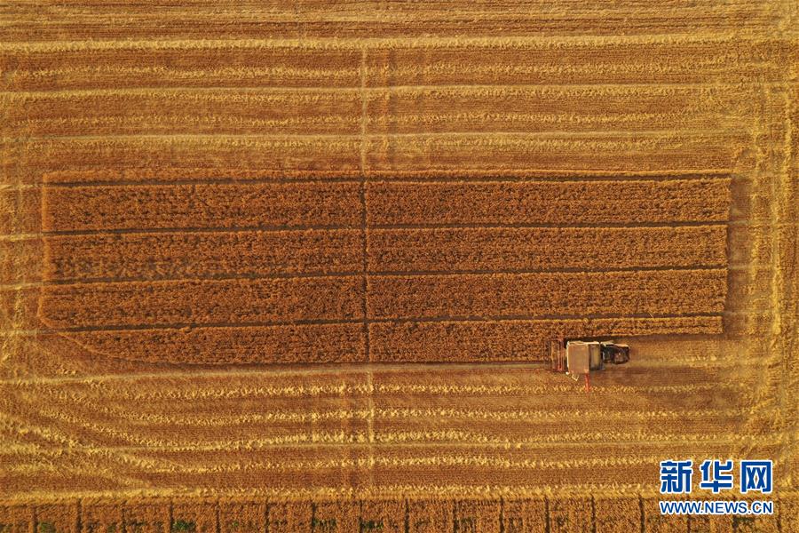 6月13日,雄安新区大王镇小王村村民在收获小麦(无人机拍摄)。近日,雄安新区小麦陆续成熟,当地村民抢抓农时进行收获。新华社记者 邢广利 摄