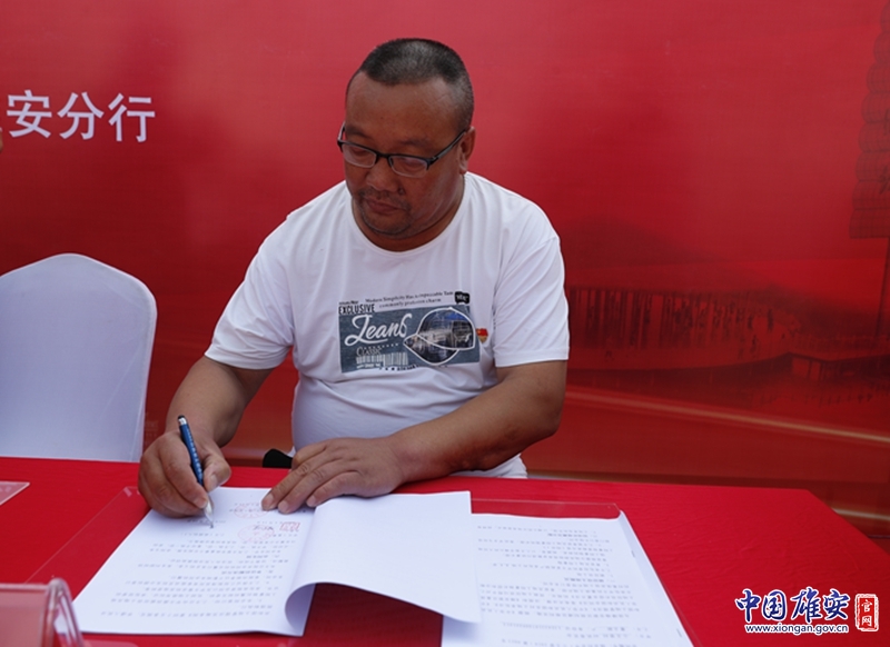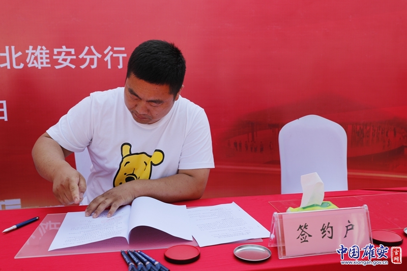 西阳村党支部书记郑贺安率先签订《雄安新区征收集体所有土地补偿、青苗及其他地上附着物补偿合同》。中国雄安官网记者封俊龙 摄