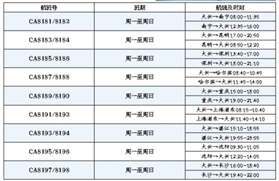 12. 2019年冬春季,国航将在大兴新机场新增部分国内航线航班,大兴始发飞往重庆、浦东、昆明、南宁、哈尔滨、深圳、长沙、沈阳、湛江航线,每天一班,2019年10月27日开始执行。
