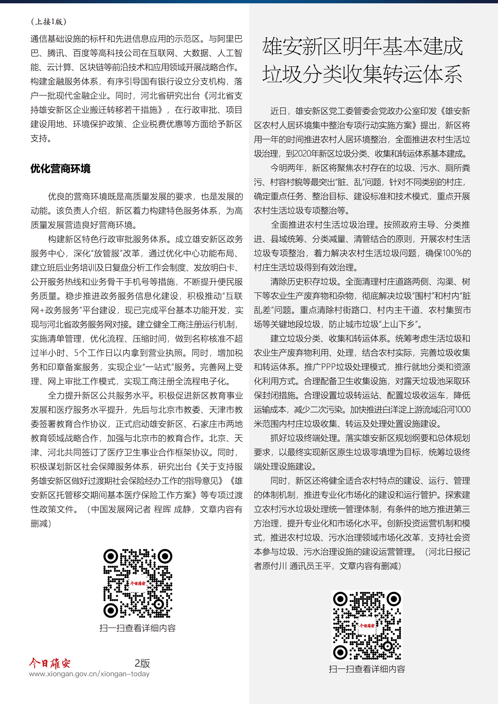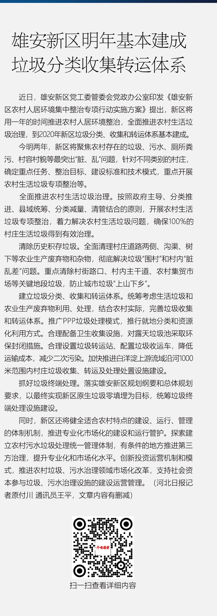 《雄安新区农村人居环境集中整治专项行动实施方案》近日印发提出,雄安新区将用一年的时间全面推进农村生活垃圾治理,到2020年新区垃圾分类、收集和转运体系基本建成。
