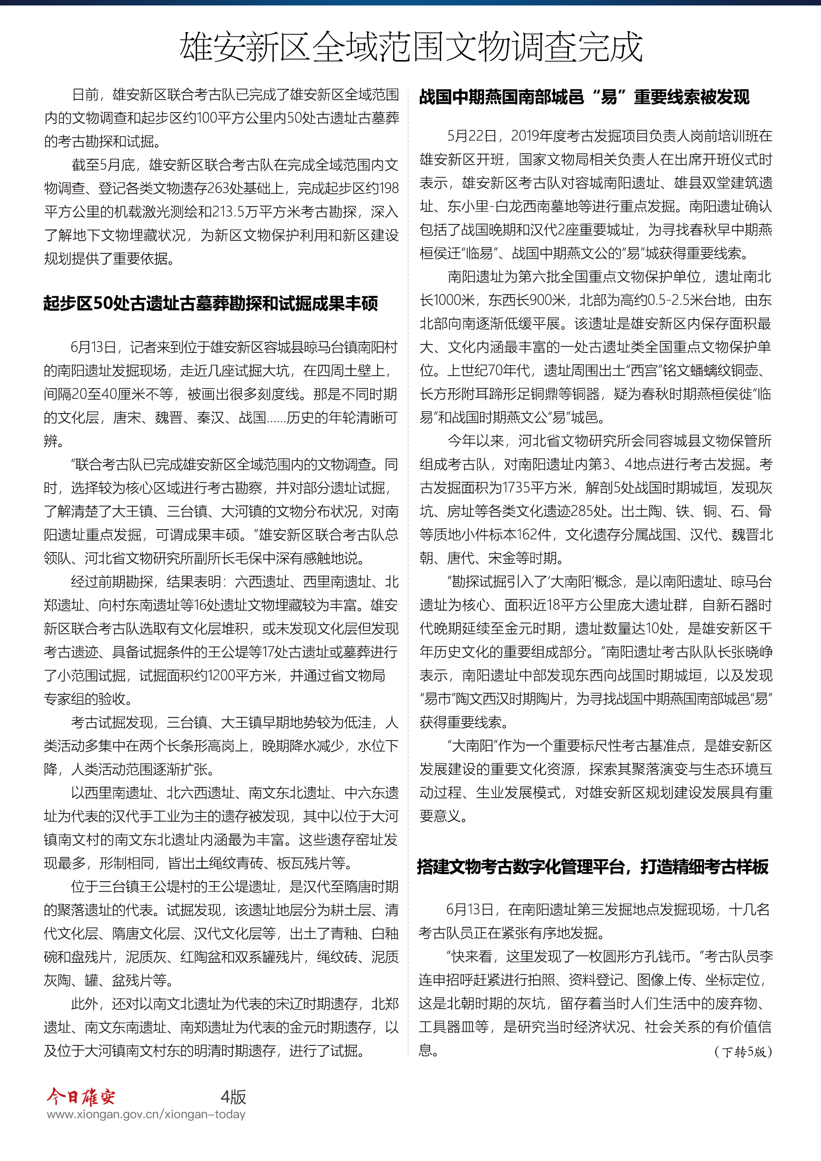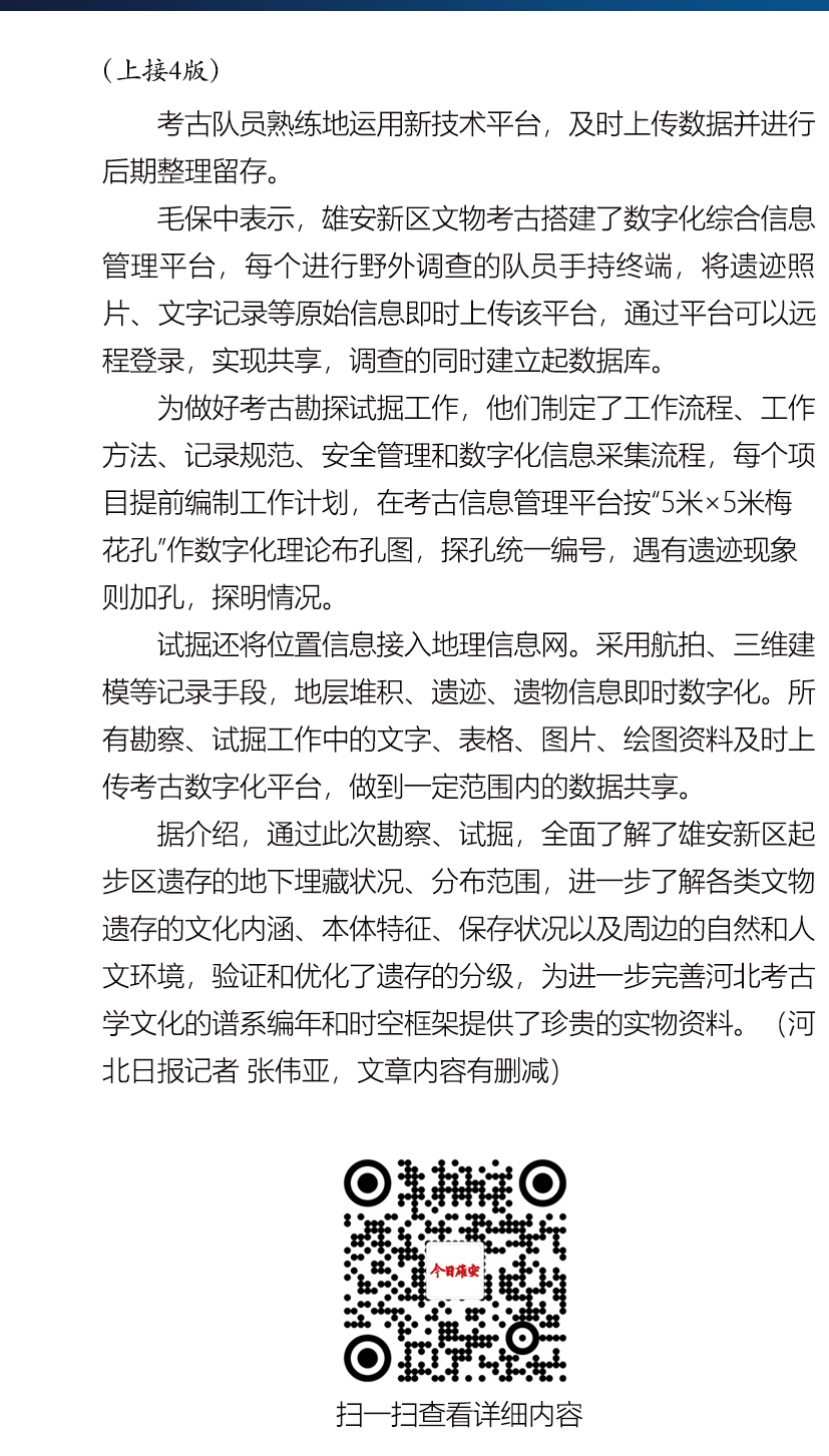 日前,雄安新区联合考古队已完成了雄安新区全域范围内的文物调查和起步区约100平方公里内50处古遗址古墓葬的考古勘探和试掘。