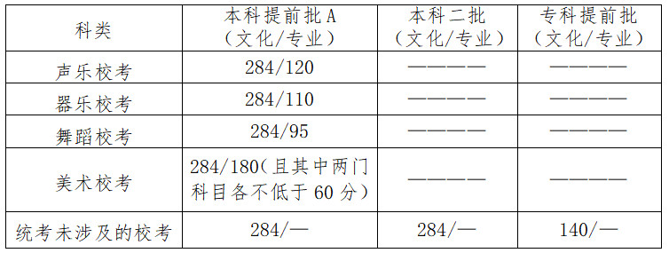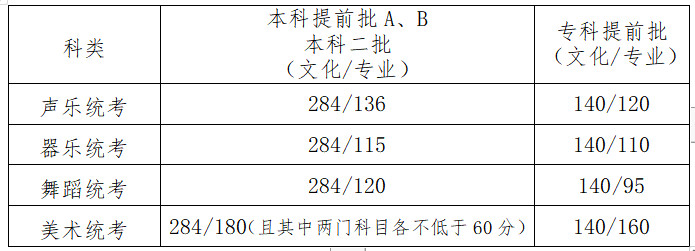 (1)按教育部规定,部分独立设置的艺术院校和参照执行的院校(或专业)艺术类本科专业,文化、专业录取控制线由学校自行确定,我省统考涉及到的专业,还需要我省相应类别专业统考合格。其艺术类专科专业:我省统考涉及的,文化、专业录取控制线按我省相应统考类执行;我省统考未涉及的,文化控制线为140分,专业控制线由院校确定。