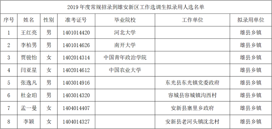 2019年度常规招录到雄安新区工作选调生拟录用人选名单